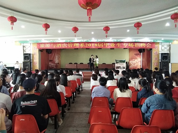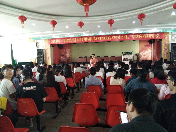 首先,王瑜教授在会上作实训、实习动员讲话。向2018届全体毕业生表达了美好的祝愿,祝愿全体毕业生都能在实训、实习岗位上学有所得,扎实专业技能,找到心仪的工作并顺利毕业。王瑜教授还向全体毕业生详细介绍了系部研讨、策划及组织本次专场招聘会的过程,并重点向员工介绍了邀请企业的标准。本次招聘会经系党政联席会议通过后,动员全系教职工积极联系优质企业,由辅导员负责做好企业用人信息及招聘会组织工作。酒店管理专业邀请企业的标准为国际连锁、星级(四星级以上)酒店,旅游管理、旅行社经营与管理专业则邀请一些与我系多次合作,有较好口碑的休闲旅游公司及旅行社。精心筛选企业、用心组织会议,为员工实训、实习工作搭建了良好的平台,赢得了员工充分肯定。