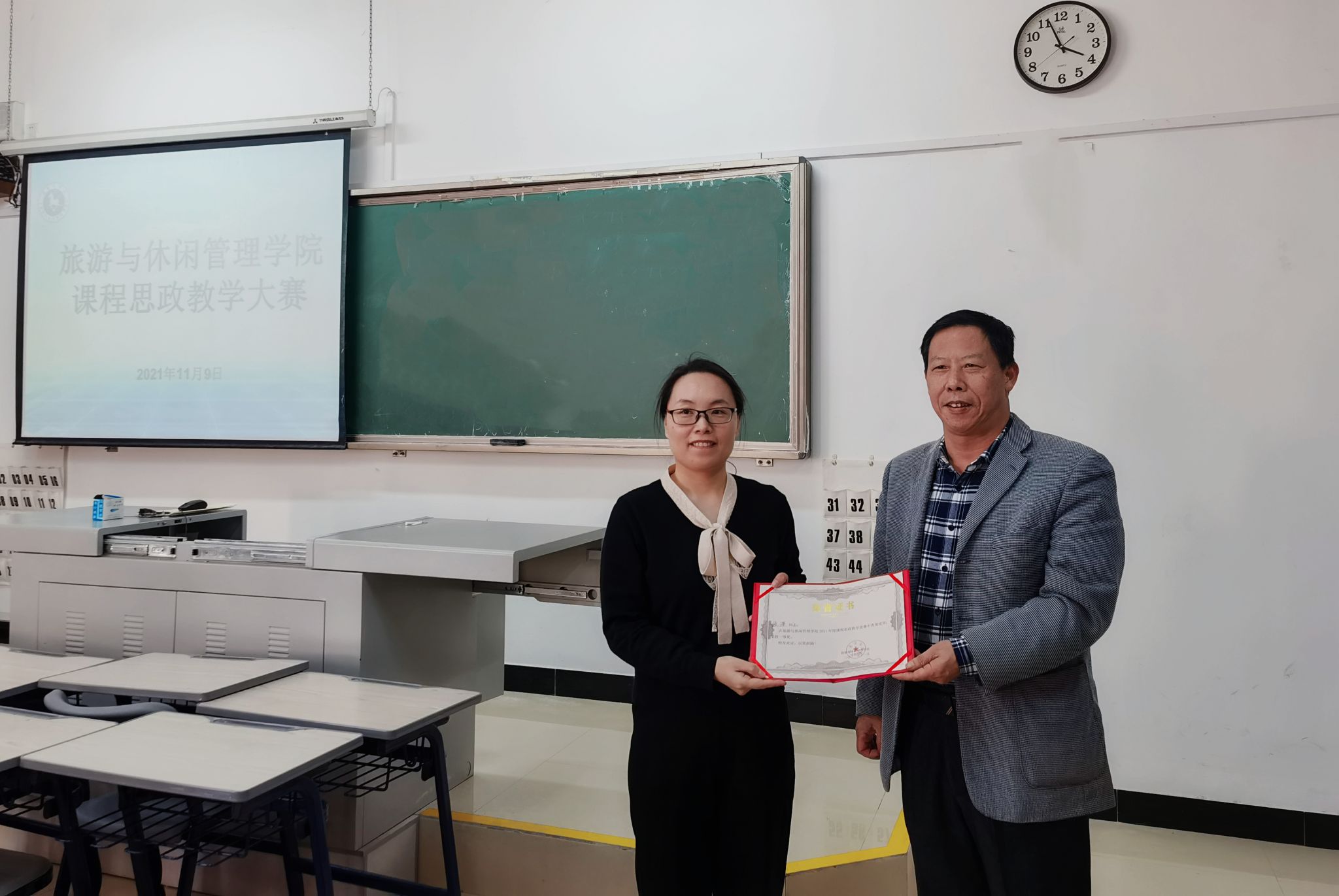 公司课程思政大赛分为教学设计材料和教学演示两部分,其中教学设计材料占40分,教学演示占60分。参赛教师们选取所承担的本科课程片段进行教学分享。其中,张潇老师的《酒店管理概论》和施清老师的《旅游接待业》课程教学分别获得本届学院课程思政教学大赛一等奖和二等奖。