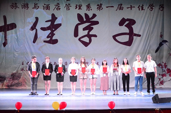 本场比赛总共分为两轮。第一轮,每个选手先自我介绍后才艺表演,由分数高到低晋级十六名选手。第二轮,知识竞赛选拔出成绩优胜的前十名选手。伴随着主持人激情的开场白,十佳学子大赛正式拉开帷幕,选手们依次上台展示自己的才艺。1号选手李文滔那自信的自我介绍以及他精彩动人的朗诵,抒发着他的激情,获得场下观众的一致好评。接下出场的是2号选手苏晶,她那热忱的自我介绍和她温柔动听的歌声,打动了台下的观众,全场掌声四起,欢呼不断。很快就到了大家期待已久的抽奖环节,现场的观众不停的刷着大屏幕也不停的滚动,恭喜被抽中的五位幸运儿。抽奖过后又到了比赛环节,现在由13号选手陈春花出场,她一出场便惹得观众席哈哈大笑,她给大家带来的表演是唱双簧,真是个幽默风趣的女孩,赢得了台下雷鸣般的掌声。许多同学都来为自己心仪的选手呐喊助威,整场比赛现场气氛十分活跃。不知不觉的第一轮比赛就告一段落,恭喜16位选手成功晋级第二轮。第二轮知识竞赛也随之开始了,十六名选手抽签决定每八名一组开始作答,由陈曦老师出题,场上的选手激烈的抢答,台下的观众看的也很是激动。不一会就到了第二组抢答,第二组由官守明老师出题,官守明老师幽默风趣,但场上的激烈丝毫不减。最终,恭喜3号选手吴凡、6号选手陈泽、8号选手陈慧娜、9号选手林钎姿、10号选手刘宇棠、11号选手陈安琪、12号选手江雨薇、18号选手孟雨、20号罗炜华、22号选手吴翔荣获十佳学子奖。活动最后,由刘祝明书记为旅游与酒店管理系的优秀干部、干事颁奖,台下掌声不断,欢呼连连,至此本次十佳学子大赛圆满落幕。