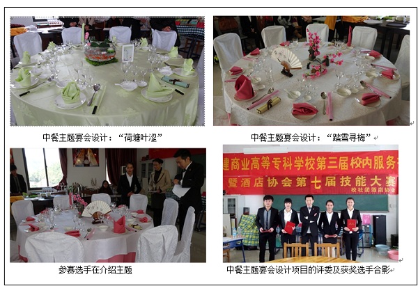 经过一个月的精心准备和层层选拔,2014年12月16日,由旅游系承办的福建商业高等专科学校第三届酒店服务技能大赛暨旅游系第七届酒店服务技能大赛在旅游系餐厅实训室顺利举行。本次技能大赛分为中餐主题宴会设计和西式宴会服务两个项目,由福州贵安世纪金源温泉大饭店宴会部范光伟经理和酒店管理教研室陈珠芳老师、张潇老师担任评委,来自13级酒店管理专业的八名同学参与了最终的角逐。