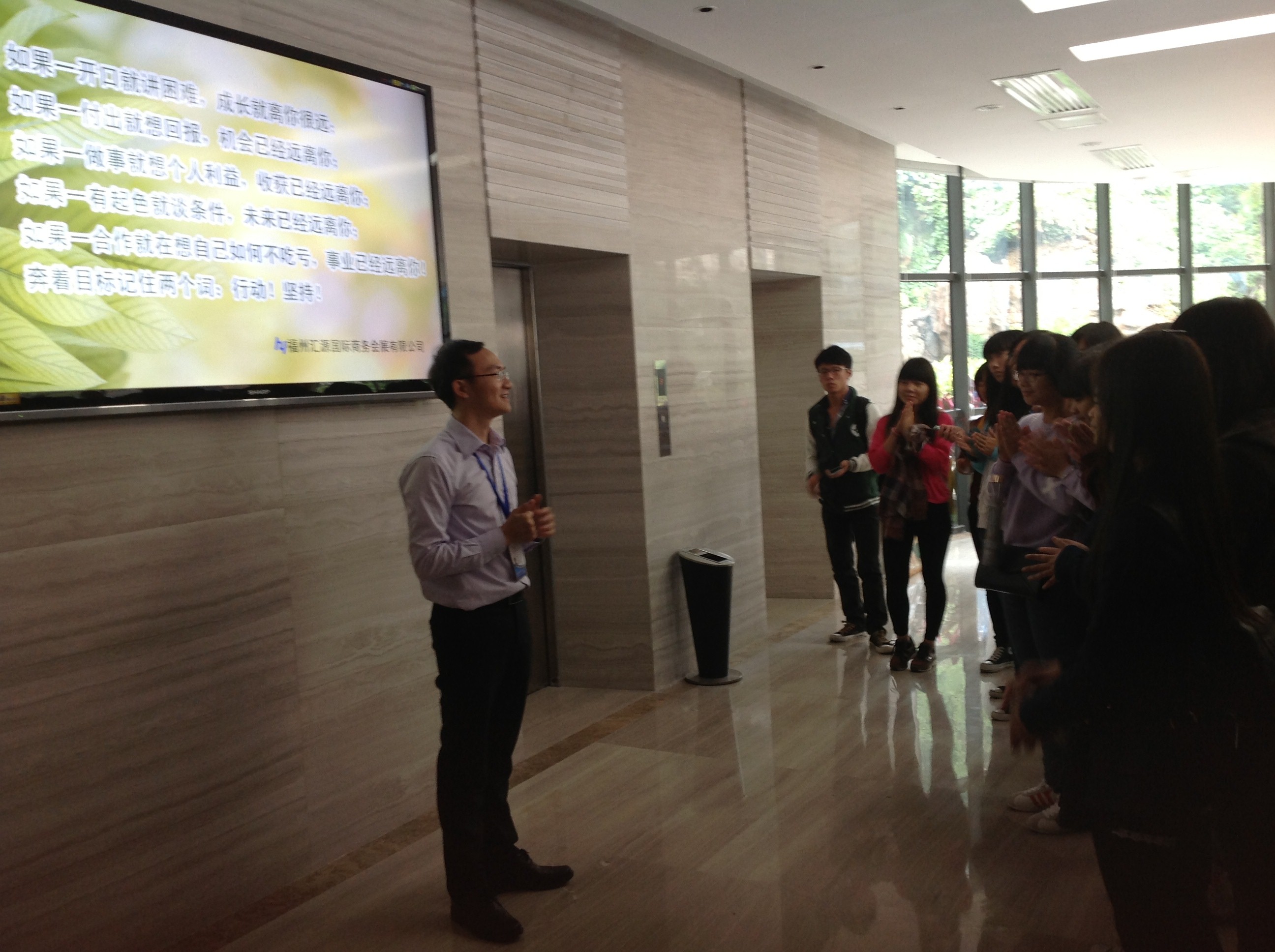 为使新生对会展专业有个直观的认知,了解行业企业最新概况,对会展企业有个整体认识,2014年11月3日上午,我系吴彩莲老师带领2014会展策划与管理专业全体员工前往福建汇源国际商务会展有限公司进行认知性学习,随行的还有会展管理教研室王林心老师。