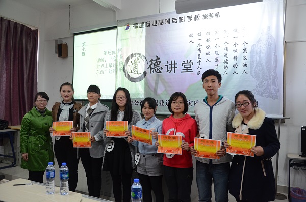 首先由主持人致开场白,介绍评委嘉宾及比赛选手并引入主题。其次,每位选手依次进行六分钟的命题演讲,参赛选手都竭尽全力的将自己最好的一面展现出来,用富有情感的语言将演讲内容体现的淋漓尽致。选手们的激情演讲让现场急速升温,经过第一轮的比拼后,排名前五位的选手进入了第二轮的角逐。第二轮为即兴演讲,选手随机选取事先由工作人员设计好的八个题目,思考30秒后进行为1分钟的即兴演讲。选手们根据所抽到的话题必须在短时间内全面的阐述了自己的观点,应变能力在这一轮充分展示。两轮激烈比赛过后,7号选手13级酒管2班的郝新杰同学荣获第一名,9号选手13级财富班的陈婉莹同学获得第二名,4号选手13级酒管1班的刘敏同学获得三等奖,另有4位选手荣获优秀奖。最后,由团总支书记左玲霞老师为获奖同学颁奖并发表讲话,旅游系“中国梦之道德当身”演讲比赛圆满结束。