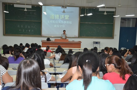 为响应学校“道德诚信”主题月的号召,营造和谐校园气氛,增强同学们从小事做起,诚实守信的意识,提高同学的自身素养,普及道德礼义,铸就诚信为人。2013年9月28日19:00-21:00在潘渡校区教学楼408,由12级旅游系辅导员—翁双木老师为2012级旅游系员工进行“诚实守信·创建文明”道德讲堂。