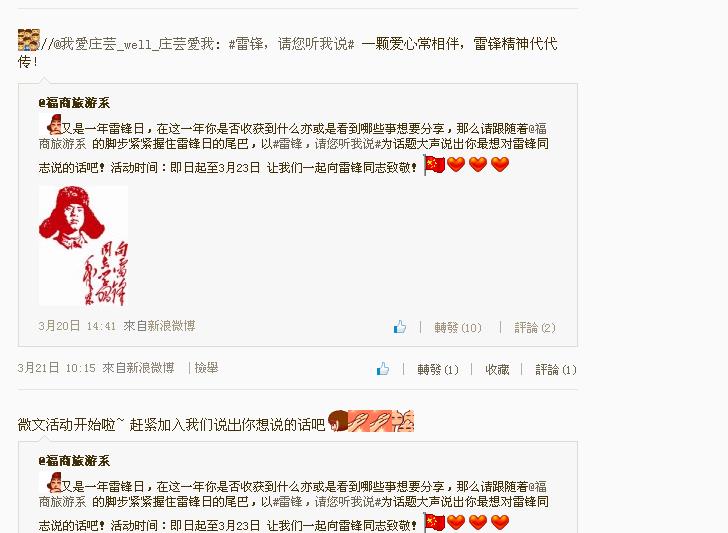 3月份在我们指尖慢慢流逝,旅游系团总支宣传部跟随着雷锋同志的脚步于2013年3月20日在我系的官方微博--@福商旅游系发起关于以“雷锋,请您听我说”为话题的微文活动。 微博话题开通后得到了我系同学们的支持,大家借助于这个平台,用真挚的语言纷纷表达了对雷锋同志的深深敬意和浓厚的敬佩之情。尽管大家话语朴素,但是对雷锋同志的那份火热的情却一直环绕在每个人心中…… 本次微文活动不仅很好的运用微博平台让大家畅所欲言,从而更好的表达对雷锋同志的敬意,而且还让更多的人了解雷锋精神,深入到雷锋队伍中,并加入到雷锋精神的行动中来。