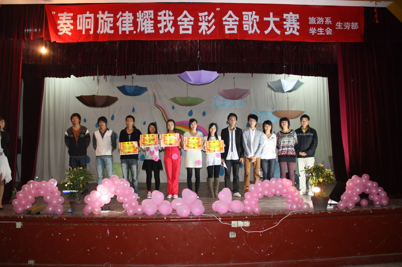 作为旅游系2010年宿舍文化节的重头戏——以“奏响旋律,耀我舍彩”为主题的舍歌比赛于11月19日晚在首山校区大礼堂举行。首山校区周一鹤书记、系团总支书记李晓佳、2010级辅导员邓盛发和首山校区部分老师共同观看了舍歌比赛。