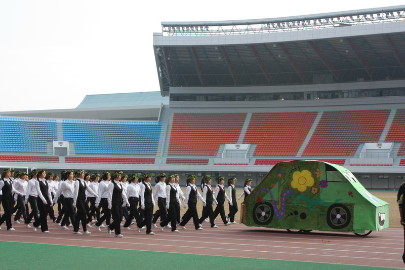 在入场式中,由系标、系旗、香车宝马、对联和六十四人组成的队列方阵以整齐的步伐、洪亮的声音和富有创意的点子征服了现场评委和观众;由大鼓、彩旗、彩带操和腰鼓组成的团体操表演,气势磅礴,鼓声雷动,得到评委和观众阵阵的掌声。队列方阵和团体操表演两项成绩综合,旅游系最终名列入场式第三名。