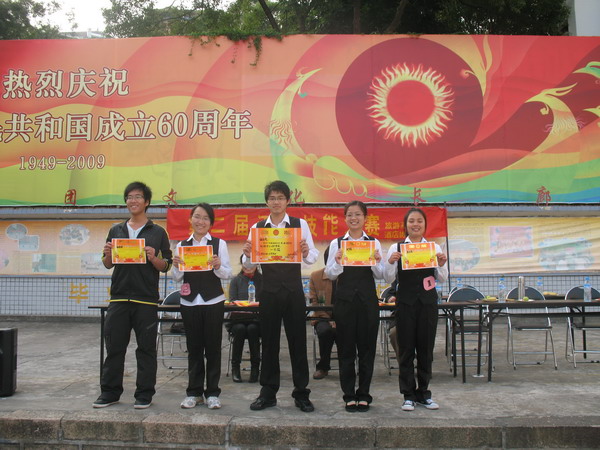 经过一番激烈的比拼,09酒管(1)班施友同同学获得了摆台第一名,09财富班林叶榕同学获得第二名,09酒管(1)班张少芬同学获得第三名;在折花比赛中,09财富班林叶榕同学获得第一名,09酒管(1)班黄梅莹和施友同同学分别获得了第二名和第三名;在斟酒比赛中,08级酒管池凌芬和黄凤娇同学分获一、二名,09酒管(2)班郑思超同学获得第三名; 09酒管(1)班摘得团体托盘接力桂冠,08旅管班获得亚军,09酒管财富班获得季军。