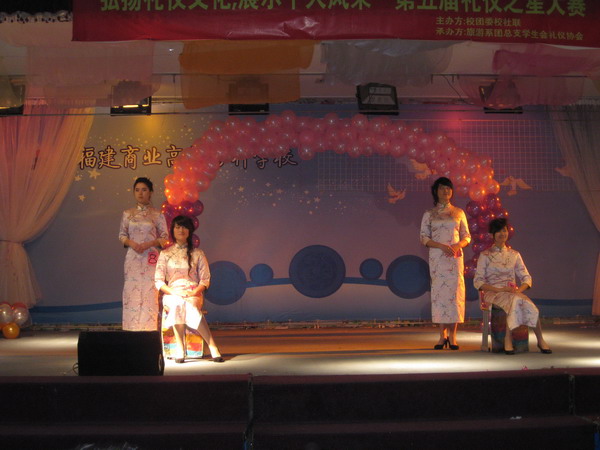 12月7日晚七点,由校团委、校社联主办,旅游系团总支、员工会承办的主题为“弘扬礼仪文化,展示个人风采”的第五届礼仪之星大赛在校活动中心拉开序幕。入围参赛的16名选手个个身穿旗袍或西装,在舞台上尽显独特的魅力。