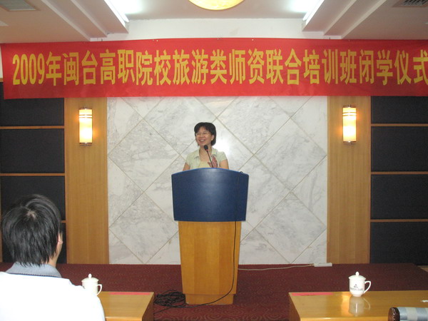 闭幕式由福建商专旅游系王瑜主任主持,福建商业高等专科学校吴贵明副董事长出席闭幕式并作结业致辞。闭幕式开始,首先由各组组长代表学员发言,大家一致认为通过培训不仅了解了闽台两地高职教育的最新理念,交流了两岸高职办学经验,尤其在校企合作、员工实践实习等方面进行了较为深入的探讨,同时,感谢福建商业高等专科学校为办好本次培训班所付出的极大努力。接着,福建商业高等专科学校吴贵明副董事长作结业致辞,她总结了此次培训班 “两高一多”特点,即专家授课水平高、学员学习热情高、培训研修内容多;提出了三点希望,即希望学员学以致用、希望学员积极探索创新、希望学员结合培训发挥教学专长,为福建高等旅游职业教育作出新的更大的贡献。最后,吴副董事长代表福建商业高等专科学校衷心感谢全体学员对本期培训班的积极配合和大力支持。