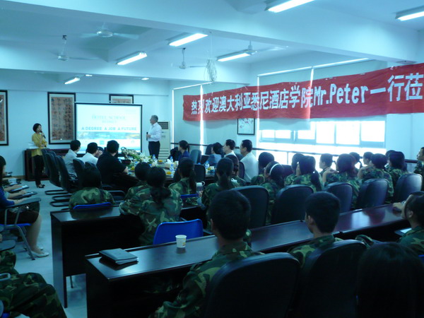 首先,Peter Lewis 先生为员工作演讲。他向员工详细介绍了悉尼酒店学院的历史背景、学校现状、课程设置、团队状况、教学特色、员工的实习以及往届毕业生的工作情况。演讲过后,PETER先生还一一解答了员工就到澳大利亚学习、生活、就业等方面提出的许多问题。见面会结束后,Peter Lewis先生还与学校就教学合作事宜进行交流。
