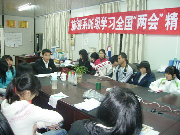 在2008年全国两会 期间,旅游系2006级员工利用电视设备、网络和报刊等媒体途径,关注两会实况。为了更深入学习贯彻全国两会精神,旅游系于3月24日晚上7点在系办组织2006级部分员工进行座谈,座谈会由年级辅导员李晓佳老师主持。